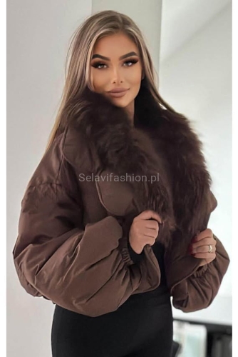 Krótka puchowa kurtka Premium z futrem brązowa SelaviFashion