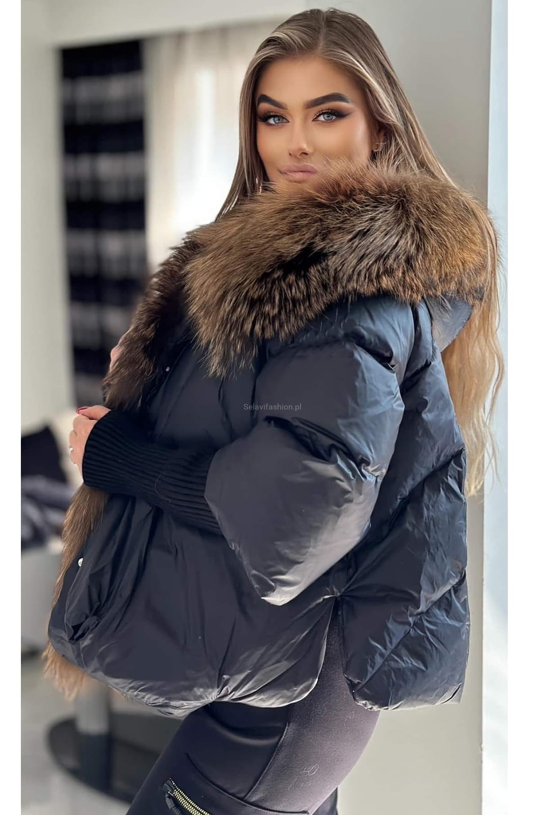 Kurtka z kapturem puchowa z naturalnym obszyciem czarna SelaviFashion
