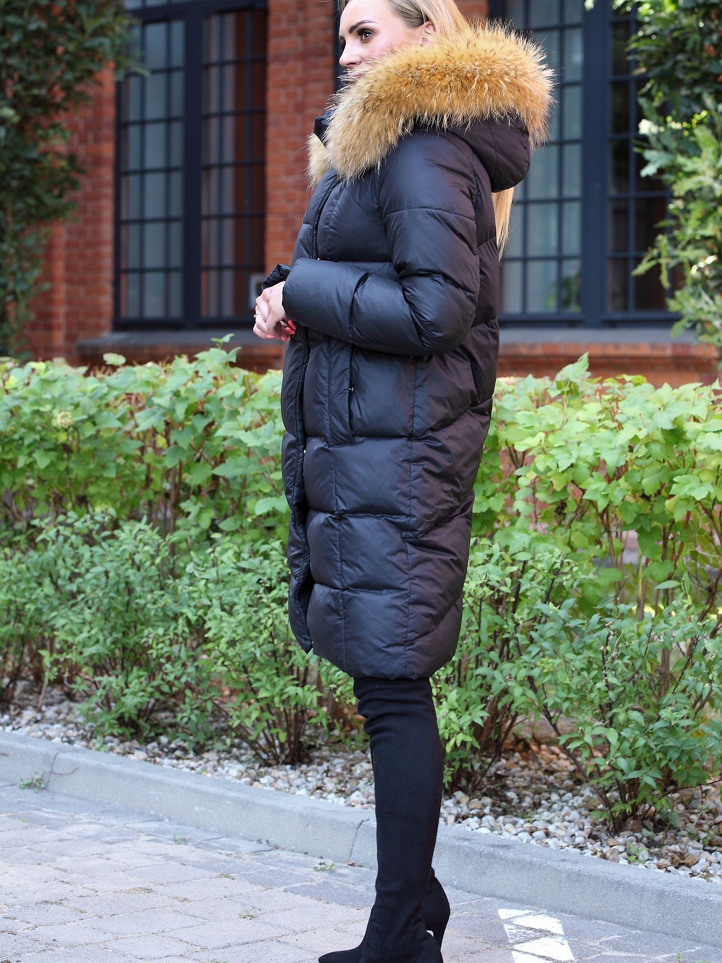 Kurtka damska puchowa z naturalnym futrem przy kapturze kolor Czarny Perso